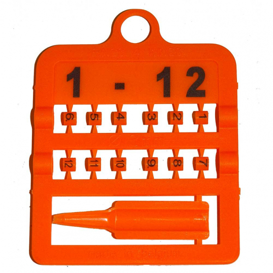 Lot de 12 bagues ouvertes en plastique numérotées de 1 à 12 avec support et outil de baguage. 10 couleurs différentes, diamètre 2.5 - 3 et 4 mm.
