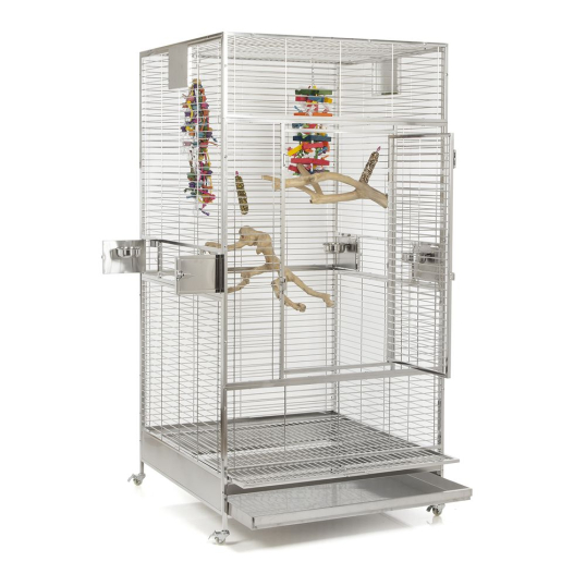 La cage en acier inoxydable Arkansas I de Montana Cages - le petit frère de l'Arkansas II. Bien entendu, la cage comprend des gamelles en acier inoxydable, un perchoir, une grille de fond amovible et des pieds à roulettes stables. L'Arkansas I dispose également de quatre portes et d'une trappe pour le nid extérieur !