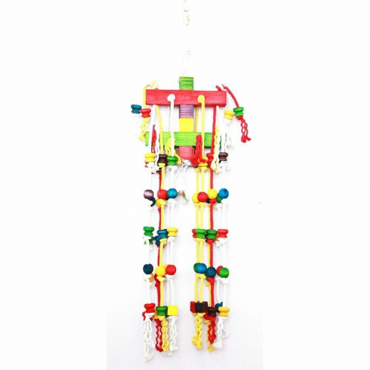 Ce jouet cascade Lunaire est un mariage de bois colorés multiforme et de corde, il sera le compagnon idéal du moyen perroquet (gris du gabon, amazone, rosalbin...) au grand perroquet (aras, grand cacatoes...). Hauteur 1 mètre, largeur 25 cm. Idéal contre l'ennui et le picage.