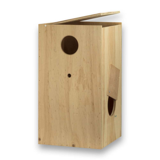 Nid en bois contreplaqué vertical pour perruches omnicolores, aratinga, pyrrhura, conure et similaires. En contreplaqué 9mm, 25*25*H45cm, diamètre du trou d'envol 70mm, ouverture sur le haut et le côté