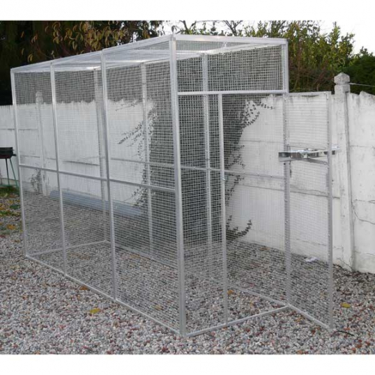 Volière de 4m x 2m x 2m de haut en alu et grillage galvanisé en maille 25 x 25, fil de 2,05 : idéal pour les moyens et grands perroquets, cacatoes. Modèle au choix : avec ou sans plateau pivotant.